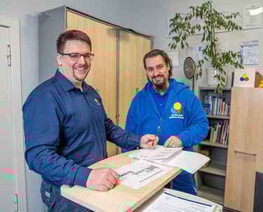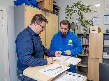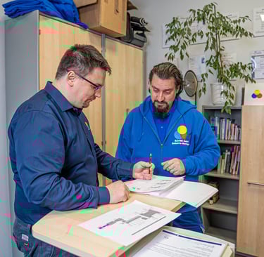 Wir sind kein Papierchaos‒Betrieb. Arbeitszeiten erfasst Du digital, Pläne bekommst Du per Mail und vieles läuft bereits digital ab – der Rest folgt Schritt für Schritt. Unser Ziel ist es, dass Du Dich auf Deine Arbeit konzentrieren kannst, nicht auf Bürokratie.